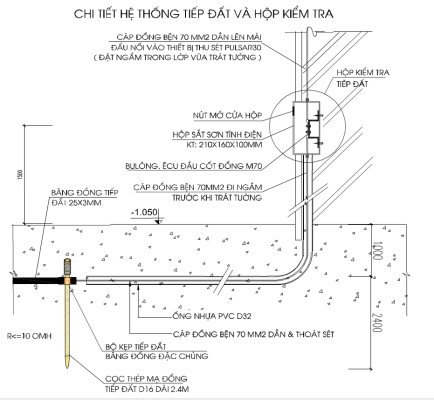 - Cọc tiếp địa được hàn chắc chắn vào cọc tiếp địa, đóng sâu xuống dưới đất.